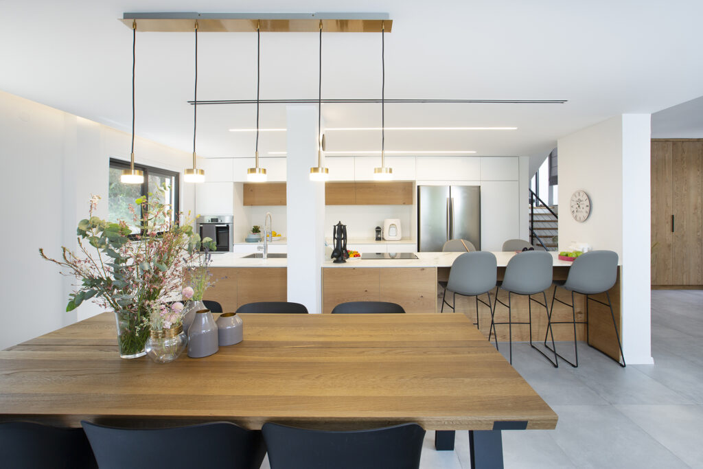 לקונספט העיצובי בית עם משמעות, ששם את המשפחה במרכזבית שהוא הלב הפועם של האנשים שחיים בו, של המשפחה, המקום המכיל שמספר את הסיפור האישי, שמייצר את התחושה של כל מה שאנחנו צריכים ומאמינים שיעשה לנו טוב, כזה שמתאים לסגנון חיים של הדיירים השואפים לאורך חיים בריא, אלה כל אותם דברים שבסופו של תהליך מתרגמים לקווים- לתכנון, לשפה עיצובית, לצבעים וחומרים..זוג מהמם, משפחה יפה, ההתקשרות ביננו התחילה לפני 7 שנים, כשנתבקשתי לתכנן ולעצב את הסלון שהיווה אתגר מבחינה תכנונית, החלטנו להפוך את כיוון הישיבה עם הפנים לגינה, לצורך העניין בנינו ספרייה (בשילוב המסך), ניצלנו את השטח שבמקור היה מיועד לפינת אוכל שלא נוצל, לטובת פינת ישיבה- הוספנו ספרייה ייעודית לספרי קריאה- כי קריאה זה מה שעושה ללקוחה טוב!, זאת עם ראייה עתידית להשלמת תכנון ועיצוב כלל החלל הציבורי. בפעימה הנוכחית התמודדנו בעיקר עם תכנון המטבח. קיימים שלל אלמנטים ורעיונות בנוגע לתכנון ועיצוב מטבחים, ומגוון פתרונות אחסון… אולם, מעבר לתכנון נכון של החלל צריך לתת את הדעת על תכנון כזה שיאפשר את הדינמיקה שמתאימה לדיירי הבית, וזאת ניתן לעשות רק מתוך הכרות של הצרכים, אורח וסגנון החיים של דייריו, כאשר השאיפה תמיד לאפשר שיפור באיכות החיים של הפרטים והמשפחה כולה.המטבח הישראלי משקף את התרבות הישראלית- שם את המשפחה במרכז!. עם השנים תפס מקום מרכזי והפך לליבו הפועם של הבית, מקום המפגש של בני הבית והאורחים, קונספט שמאוד הולם להתנהלות המשפחה הנוכחית. בהתאם לאותו קונספט עיצובי, המשכנו עם התכנון המקורי – שינינו את כיוון הכניסה הראשית לבית, הורדנו הקירות ופתחנו המטבח לחלל גדול ומרווח המהווה חלק אינטגרלי מהחלל הציבורי בבית, פינת האוכל הקטנה קיבלה את כל הכבוד והפכה לשולחן אבירים גדול ומרווח במרכז המטבח, המהווה לב ליבו של הבית ומקום מפגש משפחתי, (המאפשר גם מקום עבודה ולימודים), כולל אזור שרות מאחורי המטבח עם דלת מעבר ויציאה לחנייה (מאוד נוח להעביר הקניות מהסופר, מהרכב ישירות למקרר).בעלת הבית חיפשה תחושה של שקט, ביקשה מראה מודרני נקי ומינימליסטי. הצורך שלה להאט להירגע, לנשום ולהנות מהרגע, בא לידי ביטוי בעיצוב שקט ונקי בעיניים – ובנשמה. בהתאם לכך נבחרו שילובים של גוונים רכים בהירים וכהים המקנים תחושה של איזון, ובתוך כל הנקיון המודרני והמינימליסטי שולבו להם חומרים טבעיים (עץ, ברזל, בטון, קש, רטן, אבן, וטקסטיל), שמשלימים את הלוק הנורדי המאופיין בפשטות ומינימליזם חומרי, ובשילוב עם הצמחייה שנכנסת מהחוץ ובפנים התקבלה תחושה רגועה והרמונית.גלית ואילן יקרים, אני אסירת תודה על הדרך והתוצאה שהתקבלה, בזכות הפתיחות, השיתוף פעולה והאמון המלא שנתתם בי. תודה!!! בית עם משמעות, ששם את המשפחה במרכזבית שהוא הלב הפועם של האנשים שחיים בו, של המשפחה, המקום המכיל שמספר את הסיפור האישי, שמייצר את התחושה של כל מה שאנחנו צריכים ומאמינים שיעשה לנו טוב, כזה שמתאים לסגנון חיים של הדיירים השואפים לאורך חיים בריא, אלה כל אותם דברים שבסופו של תהליך מתרגמים לקווים- לתכנון, לשפה עיצובית, לצבעים וחומרים..זוג מהמם, משפחה יפה, ההתקשרות ביננו התחילה לפני 7 שנים, כשנתבקשתי לתכנן ולעצב את הסלון שהיווה אתגר מבחינה תכנונית, החלטנו להפוך את כיוון הישיבה עם הפנים לגינה, לצורך העניין בנינו ספרייה (בשילוב המסך), ניצלנו את השטח שבמקור היה מיועד לפינת אוכל שלא נוצל, לטובת פינת ישיבה- הוספנו ספרייה ייעודית לספרי קריאה- כי קריאה זה מה שעושה ללקוחה טוב!, זאת עם ראייה עתידית להשלמת תכנון ועיצוב כלל החלל הציבורי. בפעימה הנוכחית התמודדנו בעיקר עם תכנון המטבח. קיימים שלל אלמנטים ורעיונות בנוגע לתכנון ועיצוב מטבחים, ומגוון פתרונות אחסון… אולם, מעבר לתכנון נכון של החלל צריך לתת את הדעת על תכנון כזה שיאפשר את הדינמיקה שמתאימה לדיירי הבית, וזאת ניתן לעשות רק מתוך הכרות של הצרכים, אורח וסגנון החיים של דייריו, כאשר השא