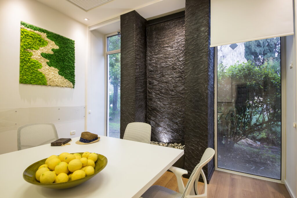 לקונספט העיצובי תכנון ועיצוב חדר ישיבות משותף לשתי חברות , רשות ניקוז ונחלים קישון, וחברת פלגי מים -ביקנעם המושבה. את הפרויקט הזה אני אוהבת במיוחד בזכות ההזדמנות שניתנה לי לתכנן ולעצב חדר ישיבות משותף של שתי חברות שעוסקות בחיבור לסביבה הטבעית ותשתיות המים. וגם בזכות הקונספט השיתופי של שיתוף במשאבים, שמאוד אקטואלי לעידן בו אנו חיים, לאור התפשטות נגיף הקורונה, שהביא איתו הרגלי עבודה חדשים- בפן התכנוני עיצובי, כאשר המגמה היא לייצר לעובדים סביבות עבודה ביתיות, או לחלוק במשאבים משותפים, במטרה להתמודד עם ההגבלות שבהתקהלות ולחסוך בהוצאות של החברות. לשם כך חדר הישיבות, שממוקם בין משרדי שתי החברות, (עם דלתות מקשרות לשני המשרדים בנפרד) עבר מתיחת פנים רצינית. נפרץ הקיר החיצוני ונפתחו פתחי אור גדולים, המאפשרים גם זרימת אויר צח והרמוניה בין החוץ והפנים, וביניהם מוקם קיר מים- מפל מים גדול מצפחה. המראה הטבעי והצליל הנעים של המים הזורמים על זיזי האבן, ובחירת החומרים הטבעיים, מדברים את הקונספט העיצובי שנבחר, שהולמים ומייצגים את אותם ערכים עליהן מושתתות החברות ולשמן פועלות. לכל היופי הטבעי הזה נוספו שתי תמונות קיר שממתגות את החברות בצורה טבעית ואומנותית, העשויות מ WILD MOSS חומר 100% טבעי, חי ונושם. האור הטבעי שנכנס מהלך היום מהפתחים הגדולים שנפתחו, והתאורה המלאכותית שתוכננה בהתאם לתרחישים, הריהוט המשרדי שנבחר המשלב עמדות עבודה אישיות עם חיבור לתשתיות (חשמל ולרשת), ציוד אודיו מתאים לשיחות קונפרנס, כסאות עבודה ארגונומיים נוחים, ופינת קפה מאובזרת כמטבחון, מאפשרים תנאים אופטימאליים לשימוש רב תכליתי באותו מרחב עבודה, המשרת את עובדי שתי החברות, ומשמש גם כעמדות עבודה אישיות, בשיטת הכסא החם. תכנון ועיצוב חדר ישיבות משותף לשתי חברות , רשות ניקוז ונחלים קישון, וחברת פלגי מים -ביקנעם המושבה. את הפרויקט הזה אני אוהבת במיוחד בזכות ההזדמנות שניתנה לי לתכנן ולעצב חדר ישיבות משותף של שתי חברות שעוסקות בחיבור לסביבה הטבעית ותשתיות המים. וגם בזכות הקונספט השיתופי של שיתוף במשאבים, שמאוד אקטואלי לעידן בו אנו חיים, לאור התפשטות נגיף הקורונה, שהביא איתו הרגלי עבודה חדשים- בפן התכנוני עיצובי, כאשר המגמה היא לייצר לעובדים סביבות עבודה ביתיות, או לחלוק במשאבים משותפים, במטרה להתמודד עם ההגבלות שבהתקהלות ולחסוך בהוצאות של החברות. לשם כך חדר הישיבות, שממוקם בין משרדי שתי החברות, (עם דלתות מקשרות לשני המשרדים בנפרד) עבר מתיחת פנים רצינית. נפרץ הקיר החיצוני ונפתחו פתחי אור גדולים, המאפשרים גם זרימת אויר צח והרמוניה בין החוץ והפנים, וביניהם מוקם קיר מים- מפל מים גדול מצפחה. המראה הטבעי והצליל הנעים של המים הזורמים על זיזי האבן, ובחירת החומרים הטבעיים, מדברים את הקונספט העיצובי שנבחר, שהולמים ומייצגים את אותם ערכים עליהן מושתתות החברות ולשמן פועלות. לכל היופי הטבעי הזה נוספו שתי תמונות קיר שממתגות את החברות בצורה טבעית ואומנותית, העשויות מ WILD MOSS חומר 100% טבעי, חי ונושם. האור הטבעי שנכנס מהלך היום מהפתחים הגדולים שנפתחו, והתאורה המלאכותית שתוכננה בהתאם לתרחישים, הריהוט המשרדי שנבחר המשלב עמדות עבודה אישיות עם חיבור לתשתיות (חשמל ולרשת), ציוד אודיו מתאים לשיחות קונפרנס, כסאות עבודה ארגונומיים נוחים, ופינת קפה מאובזרת כמטבחון, מאפשרים תנאים אופטימאליים לשימוש רב תכליתי באותו מרחב עבודה, המשרת את עובדי שתי החברות, ומשמש גם כעמדות עבודה אישיות, בשיטת הכסא החם. back to Portfolio